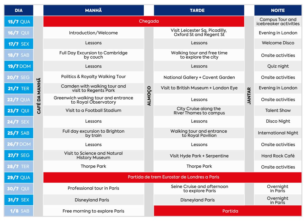 - Atividades diárias após as aulas, incluindo London Eye e British Museum;