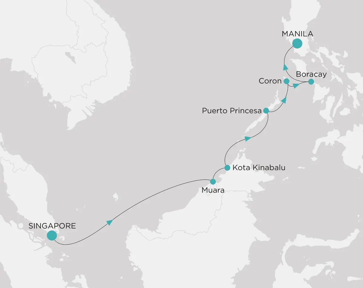 Embarque em um cruzeiro inesquecível de Singapura a Manila, explorando destinos deslumbrantes como Brunei, Malásia e as paradisíacas ilhas das Filipinas. Descubra cavernas misteriosas, praias de águas cristalinas e cenários culturais vibrantes. Relaxe no oceano e viva momentos únicos em um roteiro que combina aventura, arte e natureza exuberante.